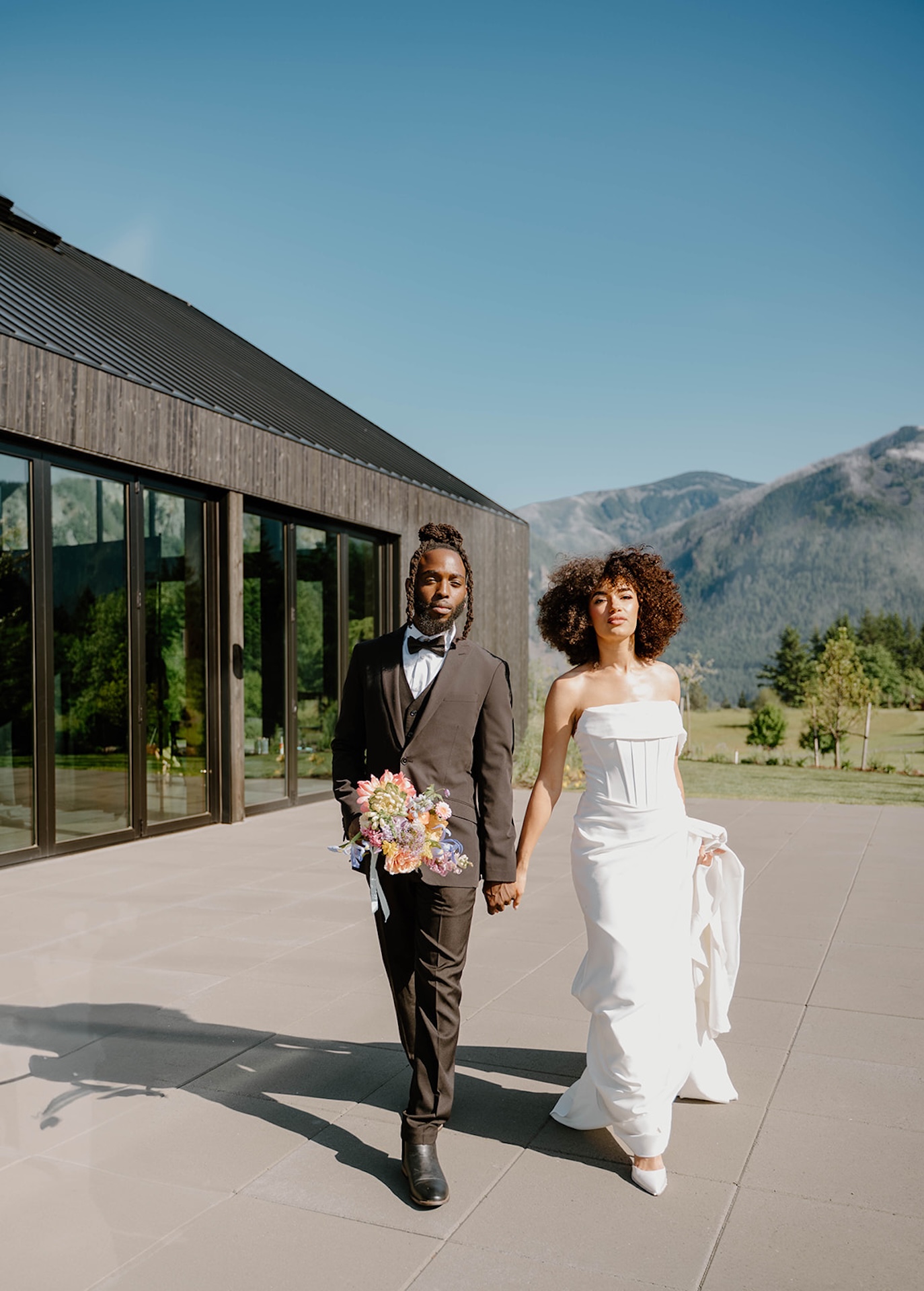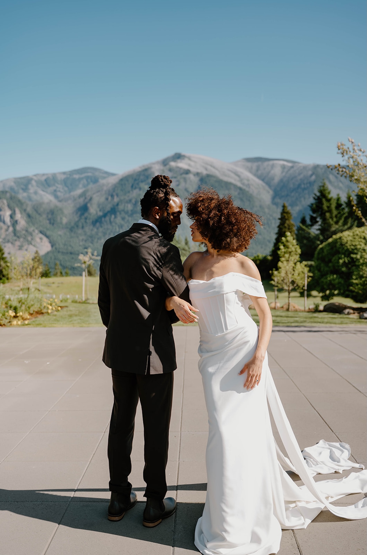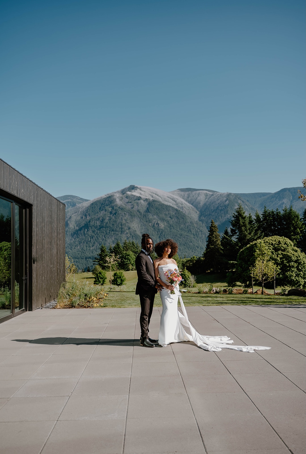 Bride and groom standing together on a modern patio during a wind mountain ranch wedding, with sweeping mountain views and greenery surrounding them.
