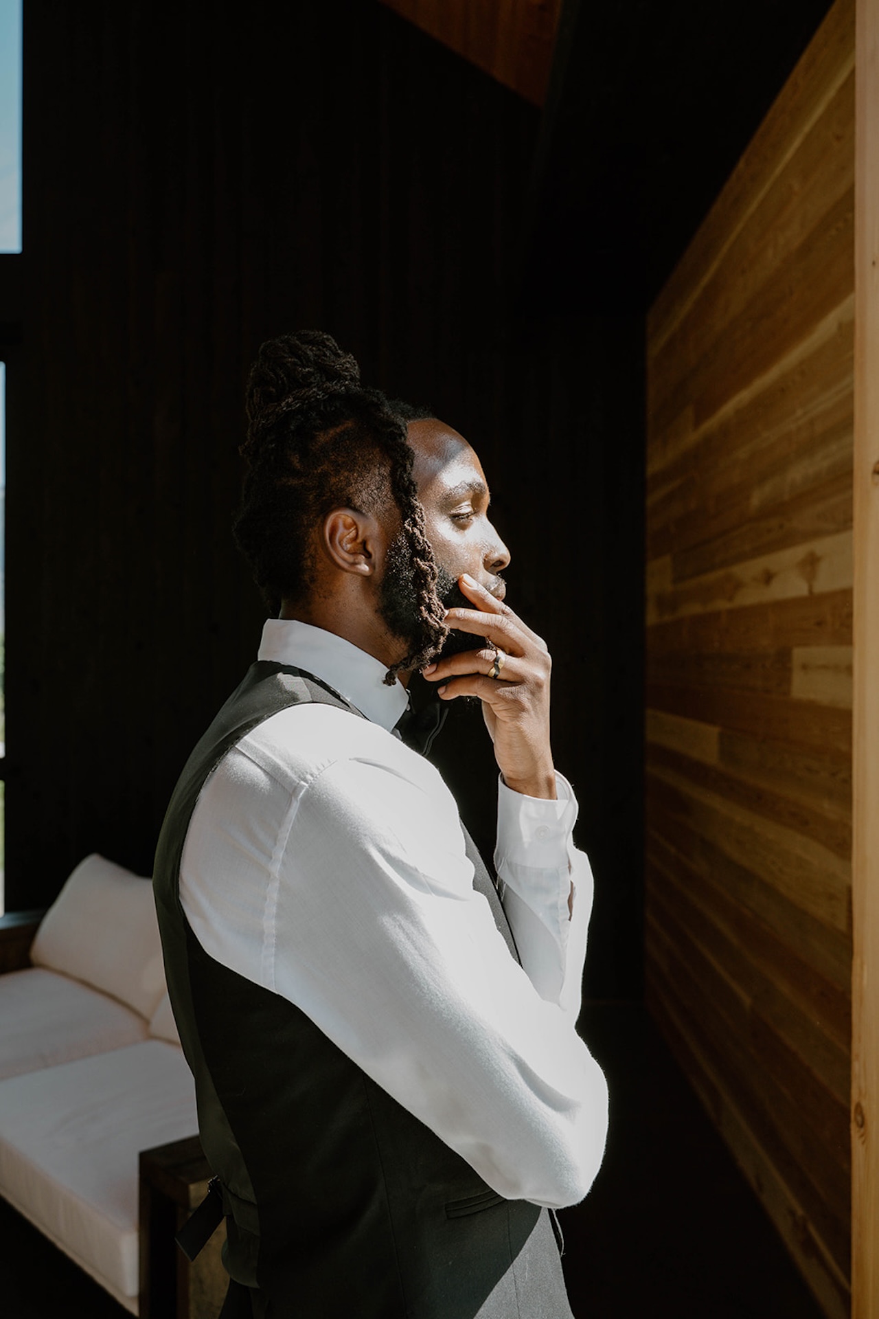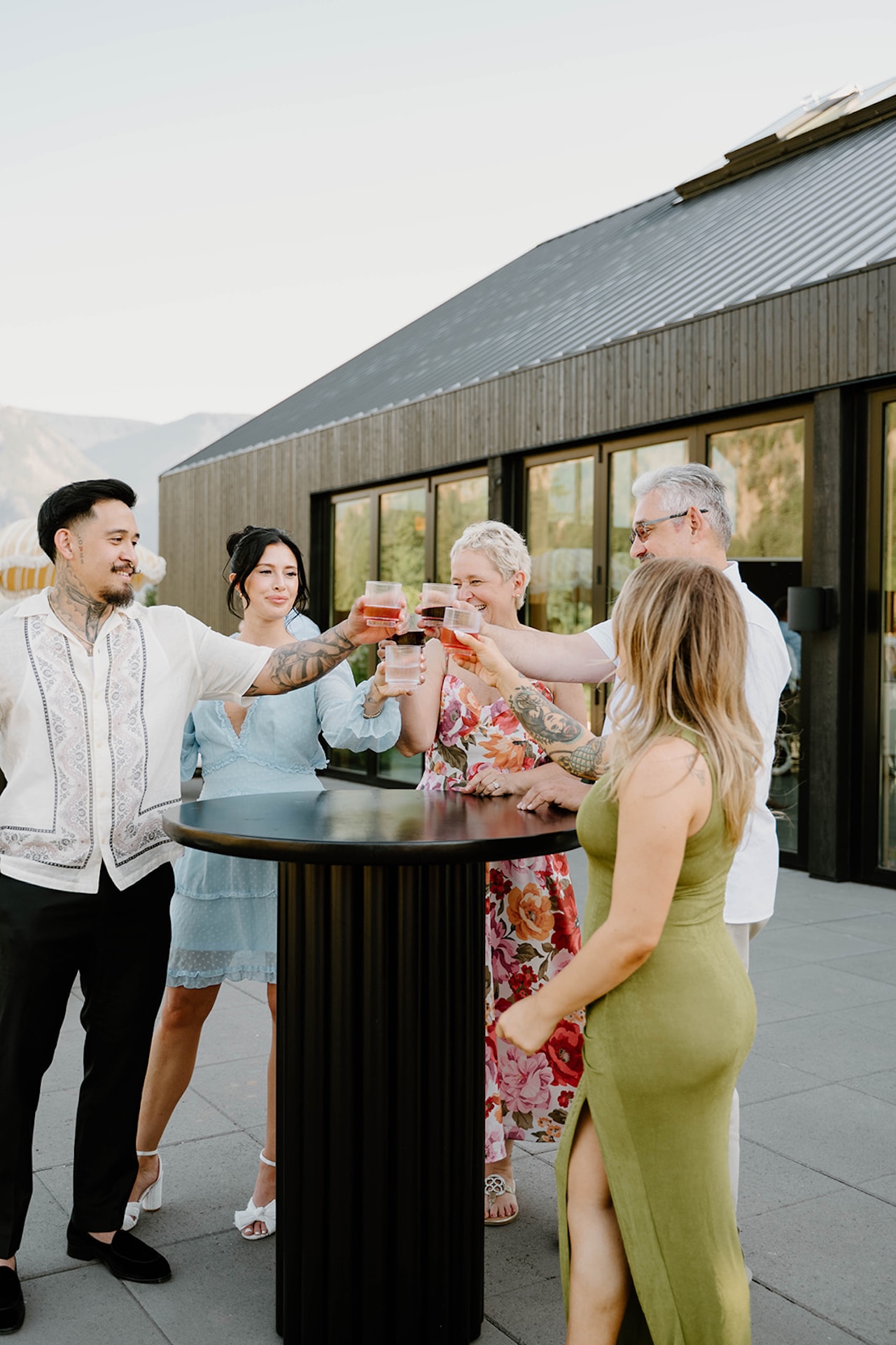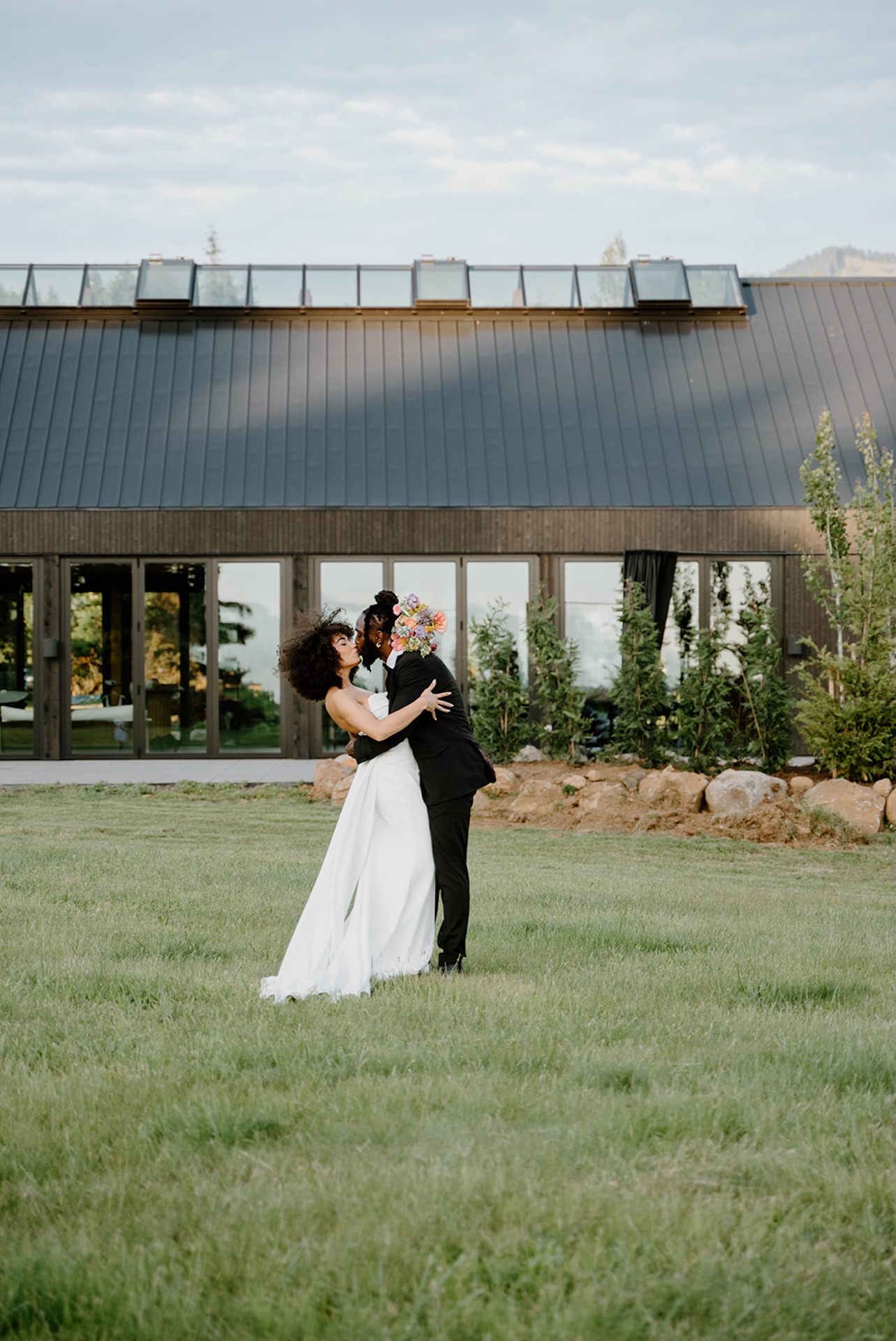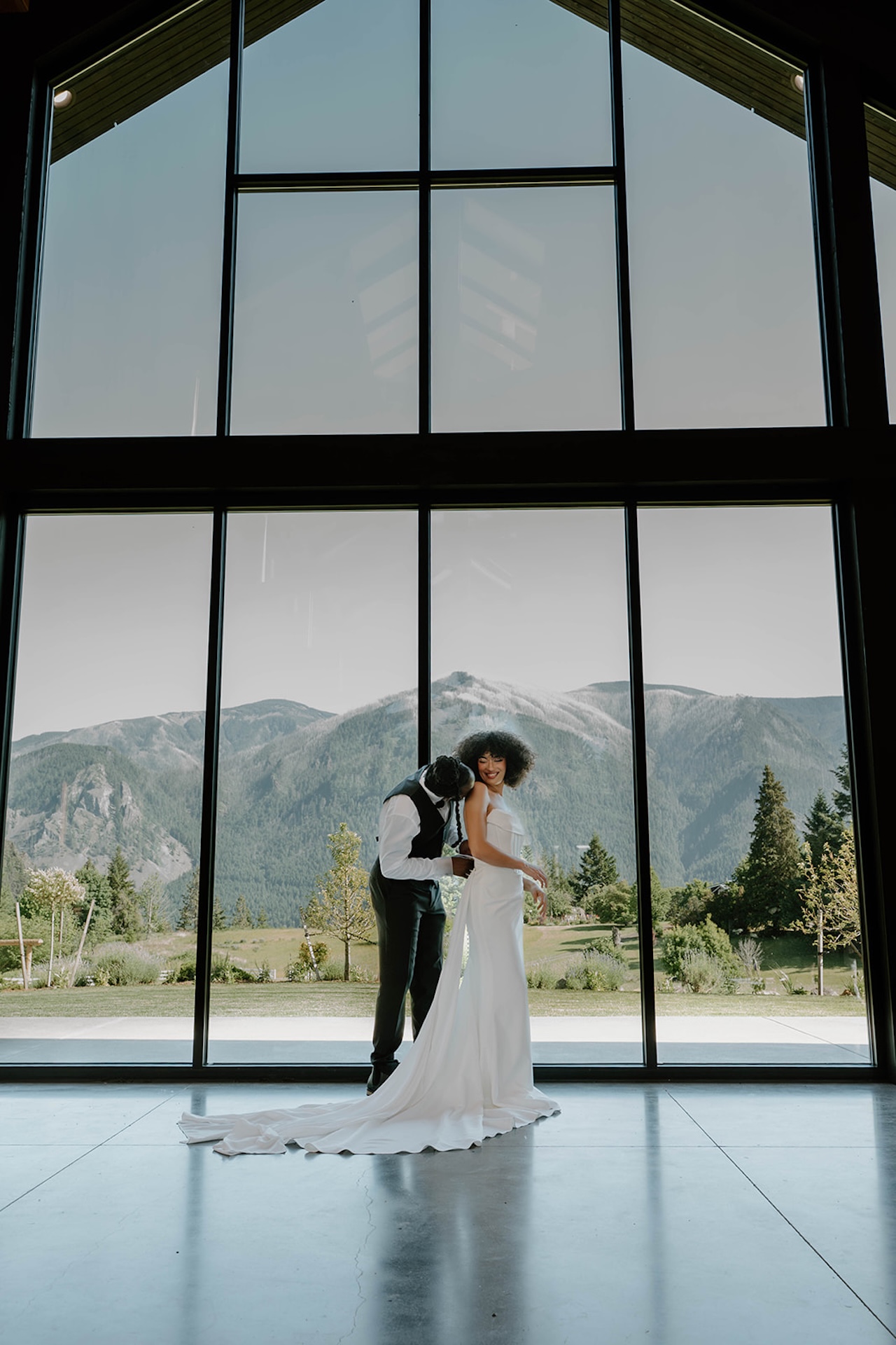 Bride and groom standing together on a modern patio during a wind mountain ranch wedding, with sweeping mountain views and greenery surrounding them.